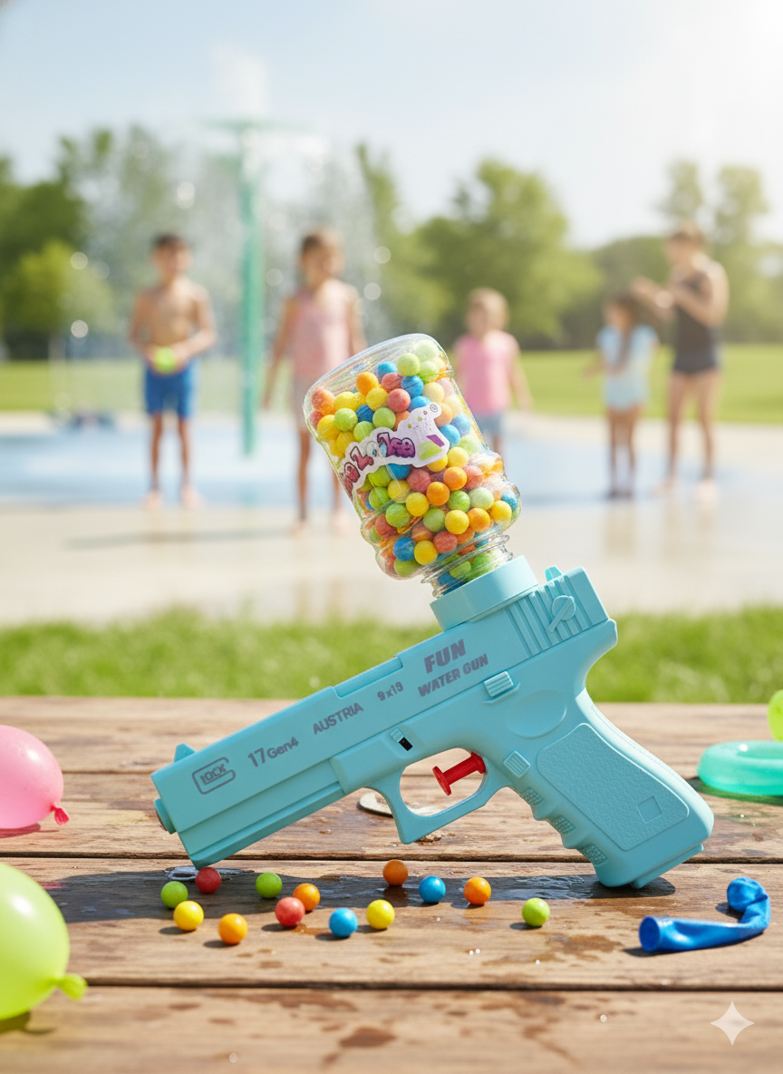 Incluye una pistola de agua liviana y fácil de usar, ideal para jugar con amigos, y un pack de caramelos ricos para completar la experiencia 🎉✨.