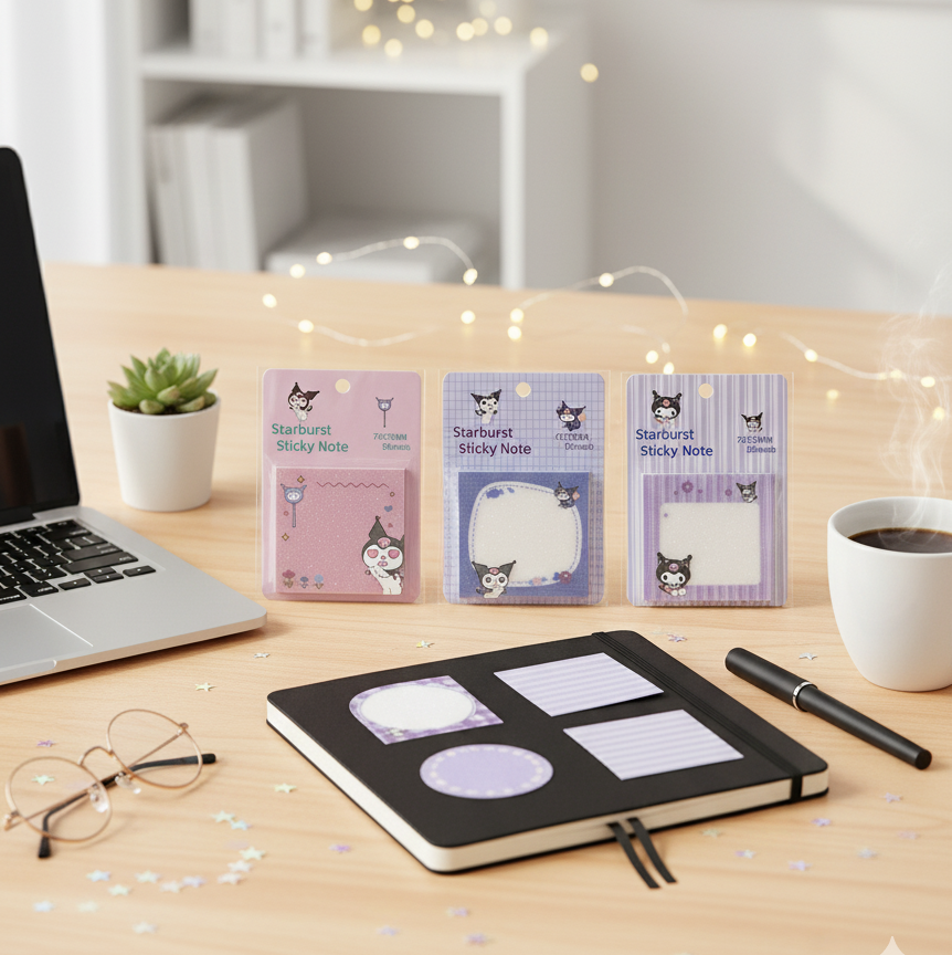 Estos post-it temáticos de Kuromi son perfectos para dejar recordatorios, mensajes o decorar tus apuntes y libretas con mucho estilo. 🖋️💜