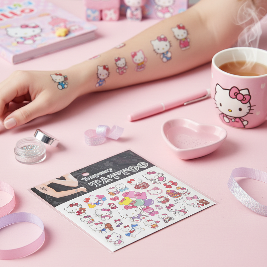 Con diferentes modelos y poses de Hello Kitty, cada tatuaje agrega un toque dulce y divertido a tu look.